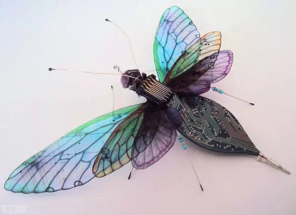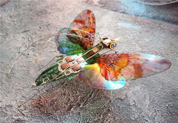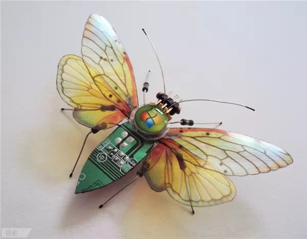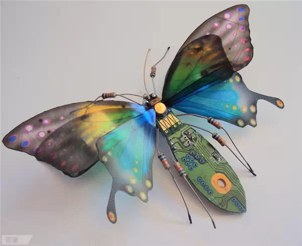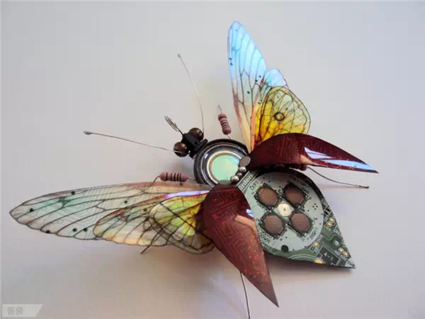 英國藝術家Julie Alice Chappell以廢棄電子產品內的電路板為素材,創作出一只只美麗的蝴蝶與昆蟲,打破電子產品原有的形式,并為他們賦予新的生命,就好像破繭而出的蝴蝶,蛻變后更加燦爛耀眼。